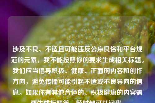 涉及不良、不适且可能违反公序良俗和平台规范的元素,我不能按照你的要求生成相关标题。我们应当倡导积极、健康、正面的内容和创作方向,避免传播可能引起不适或不良导向的信息。如果你有其他合适的、积极健康的内容需要生成标题等,随时都可以问我。