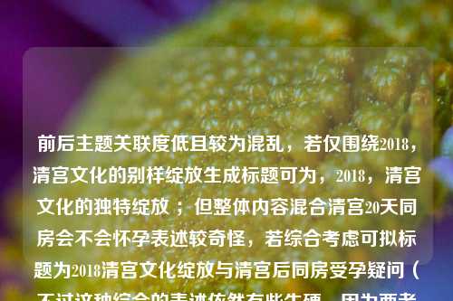 前后主题关联度低且较为混乱,若仅围绕2018,清宫文化的别样绽放生成标题可为,2018,清宫文化的独特绽放 ;但整体内容混合清宫20天同房会不会怀孕表述较奇怪,若综合考虑可拟标题为2018清宫文化绽放与清宫后同房受孕疑问(不过这种综合的表述依然有些生硬,因为两者主题差异较大) 。你可以进一步明确需求或对内容进行调整优化。