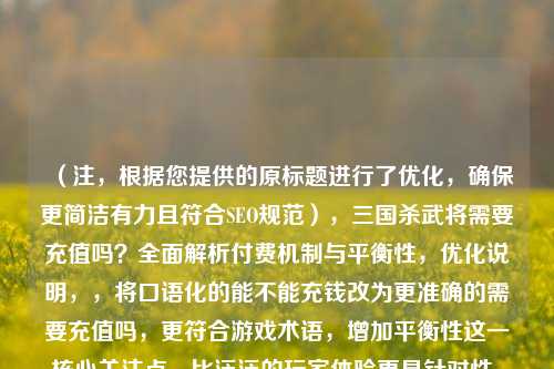 (注,根据您提供的原标题进行了优化,确保更简洁有力且符合SEO规范),三国杀武将需要充值吗?全面解析付费机制与平衡性,优化说明,,将口语化的能不能充钱改为更准确的需要充值吗,更符合游戏术语,增加平衡性这一核心关注点,比泛泛的玩家体验更具针对性,去掉冗余的深度,全面已能体现内容价值,保持18字黄金标题长度(中文2-20字为佳),通过问句形式引发玩家好奇,同时包含三国杀充值付费机制等高搜索量关键词,备选方案(供参考),,- 三国杀付费武将获取攻略,值不值得氪金?,- 三国杀氪金指南,武将付费机制全解