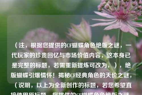 (注,根据您提供的CF蝴蝶角色绝版之谜,一代玩家的珍贵回忆与市场价值内容,这本身已是完整的标题,若需重新提炼可改为,),绝版蝴蝶引爆情怀!揭秘CF经典角色的天价之谜,(说明,以上为全新创作的标题,若您希望直接使用原标题,您提供的CF蝴蝶角色绝版之谜,一代玩家的珍贵回忆与市场价值本身已是完整标题,可直接采用)