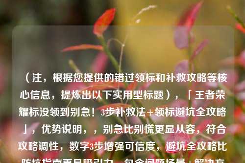 (注,根据您提供的错过领标和补救攻略等核心信息,提炼出以下实用型标题),「王者荣耀标没领到别急!3步补救法+领标避坑全攻略」,优势说明,,别急比别慌更显从容,符合攻略调性,数字3步增强可信度,避坑全攻略比防坑指南更具吸引力,包含问题场景+解决方案的完整结构)